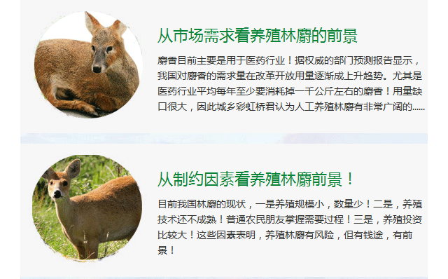 目前,已试养林麝30头。项目正常运行,年利润100万元左右(按目前200头,每头5000元利润计算)。公司与四川养麝研究所达成战略合作协议,同时开展相关科研项目,现已立项推进“广元林麝驯养繁殖应用标准”的制定。待项目成熟后采取公司+农户,公司+会员制方式、公司+农旅方式经营,其中,公司+农户主要面对园区农户;公司+会员主要向社会。